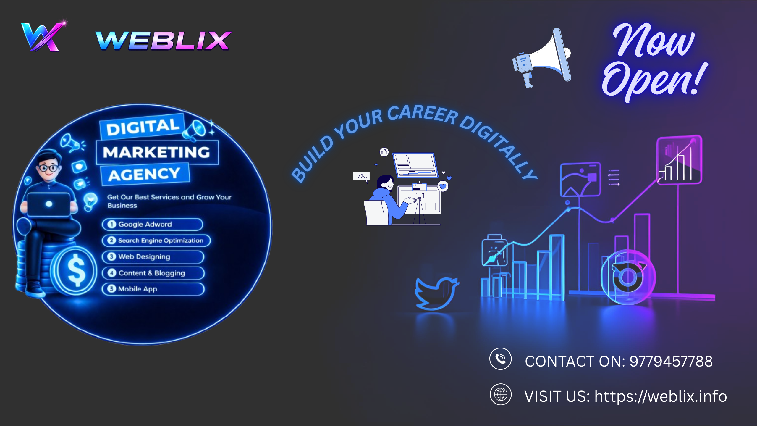 At Weblix, we combine creativity, technology, and marketing expertise to help brands succeed in the digital world. From website development to SEO and social media marketing, we deliver solutions that drive real business growth.Weblix is a results-driven digital marketing agency focused on helping businesses grow online. We create powerful websites, run high-performing marketing campaigns, and build strategies that increase traffic, leads, and sales.Weblix helps businesses establish a strong online presence through modern websites and smart digital marketing strategies. Our mission is to turn your ideas into digital success.